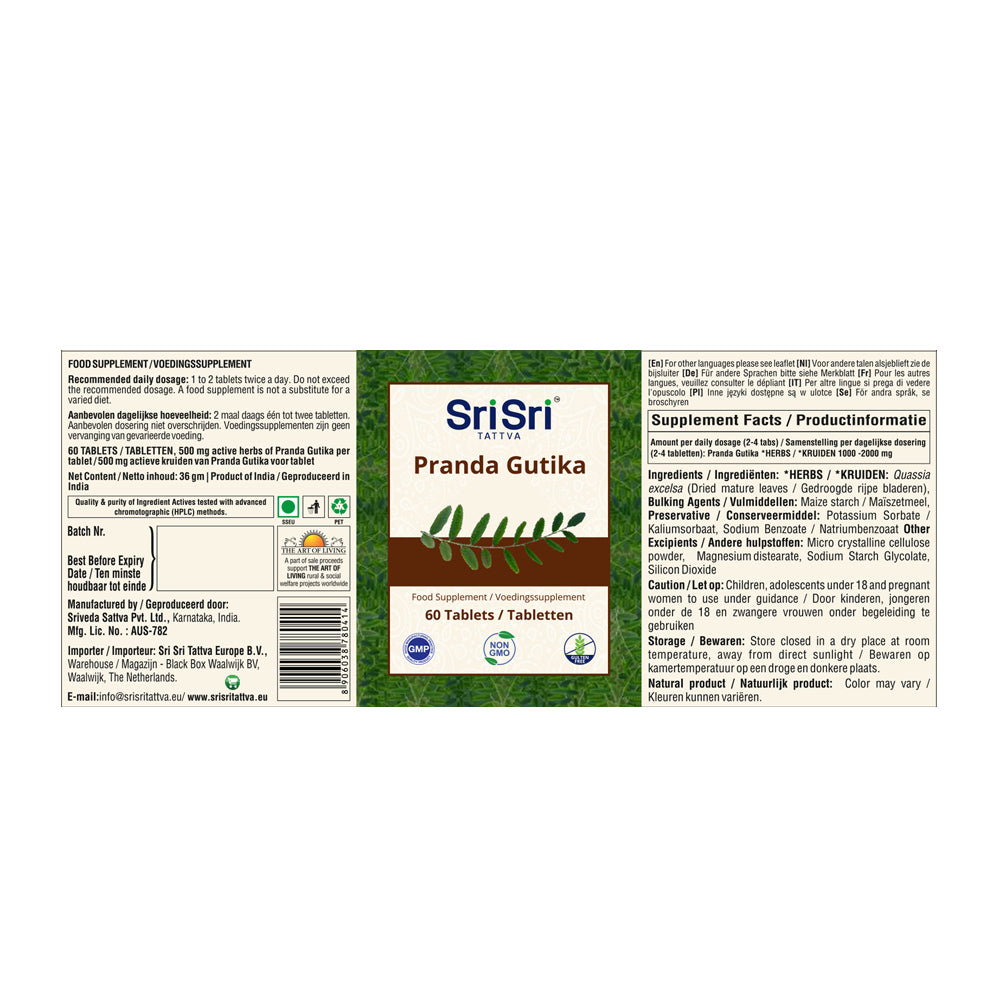 Pranda Gutika dolazi u obliku tableta i napravljena je od Simaroube, roda drveća i grmlja iz obitelji Simaroubaceae, porijeklom iz neotropa. Ovaj pripravak Pranda Gutika tradicionalno se pravi sa šećerom ili jaggerom. U ayurvedskoj tradiciji i sustavima alternativne medicine hrana se smatra lijekom, stoga se šećer može koristiti iu specifičnim ayurvedskim tretmanima.