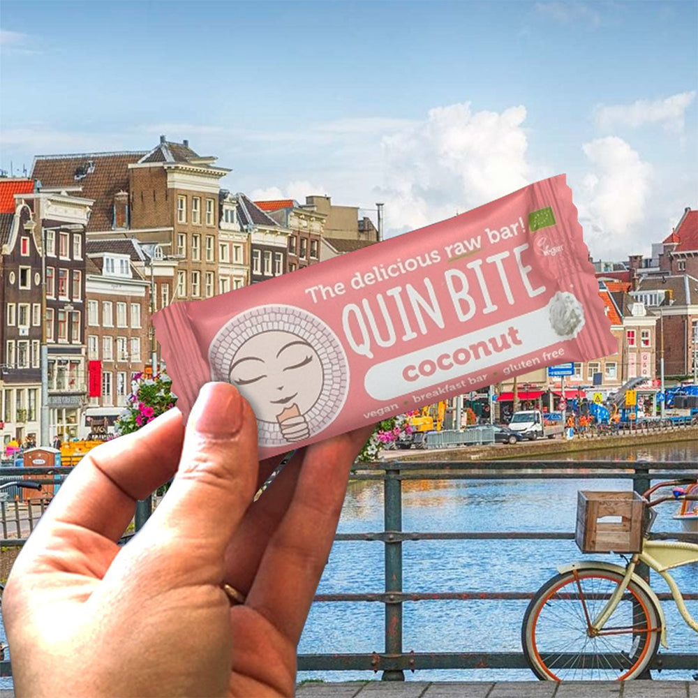 Pojedinačni komad / 12 jedinica po kutiji: Quin Bite Coconut dolazi u kutiji s 12 pojedinačnih sirovih pločica.