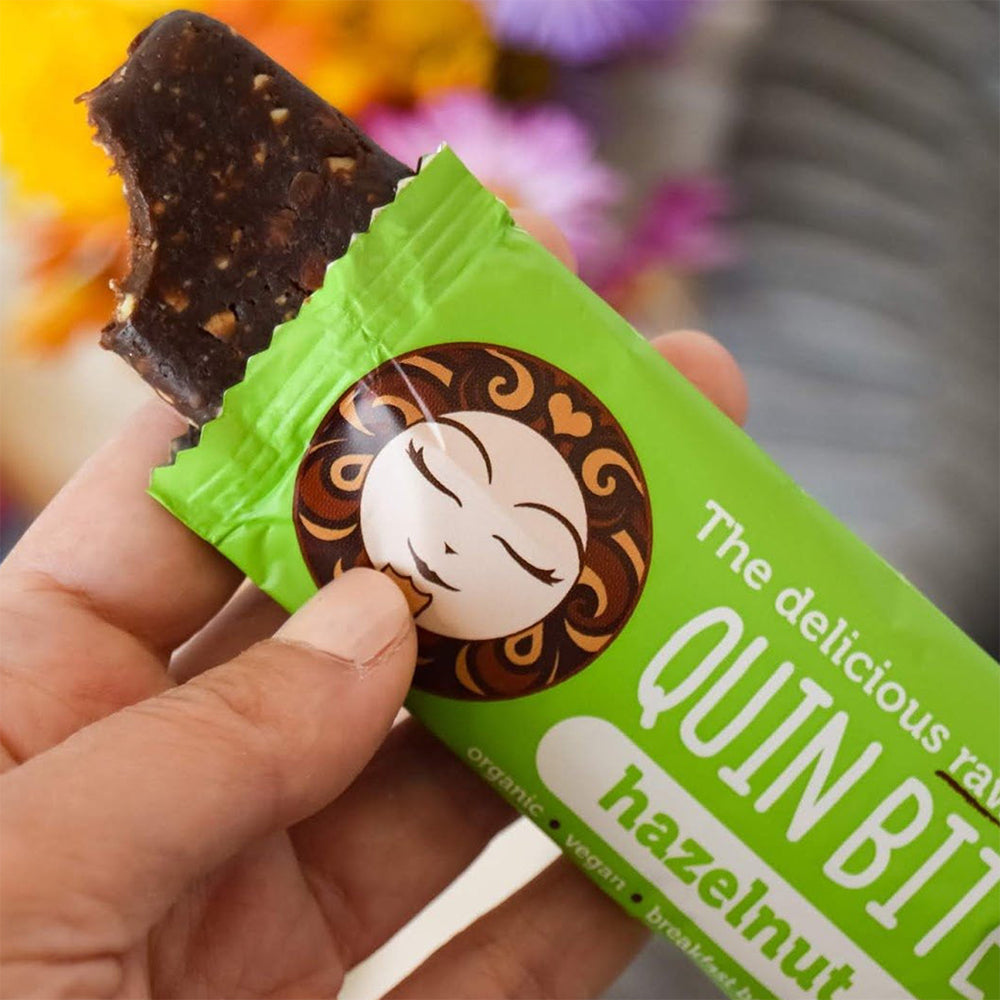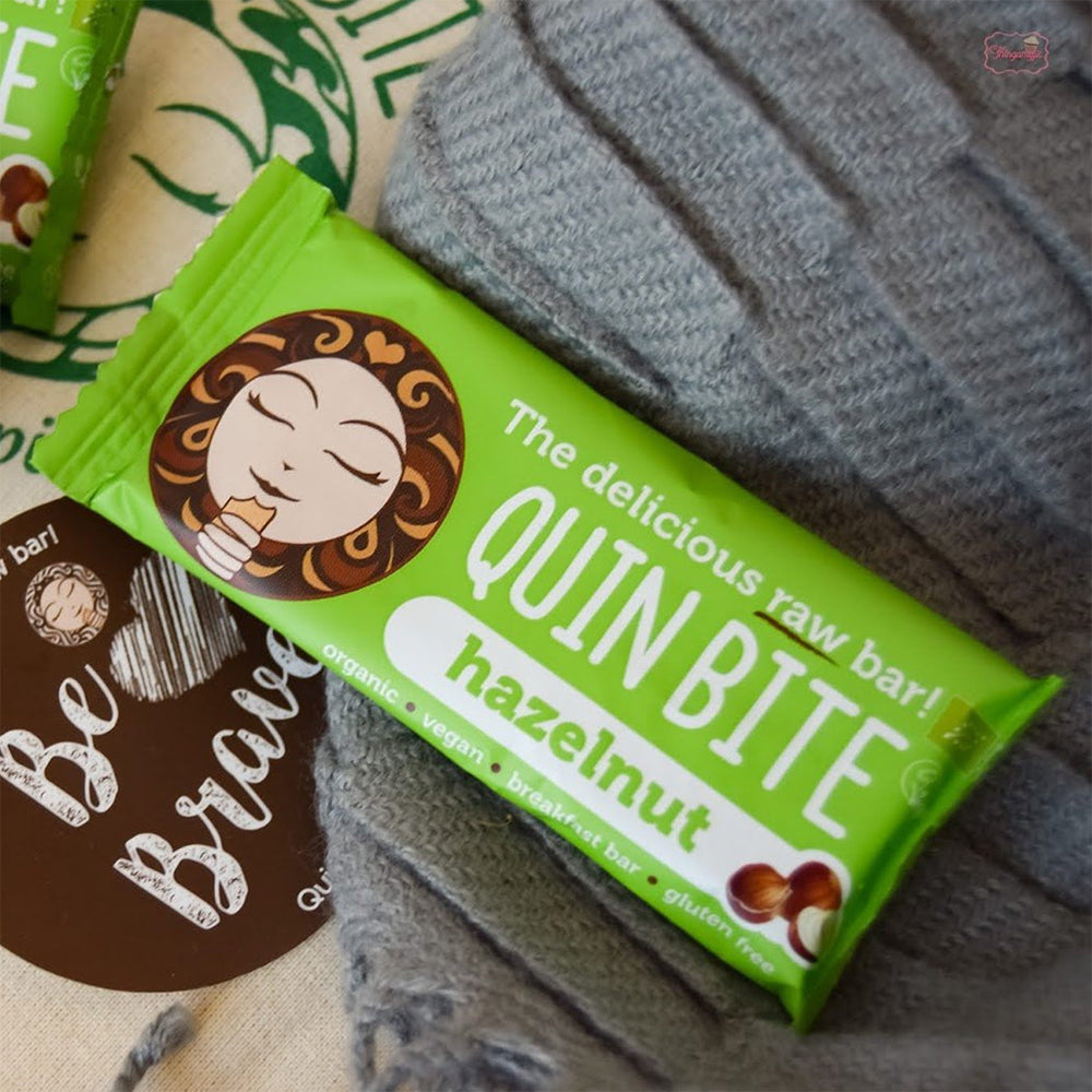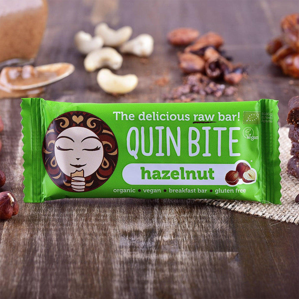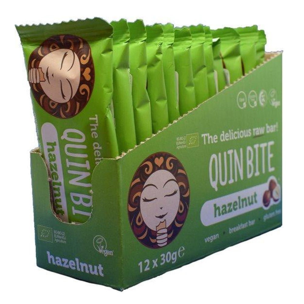 Pojedinačni komad / 12 jedinica po kutiji: Quin Bite Hazelnut dolazi u kutiji s 12 pojedinačnih sirovih pločica.